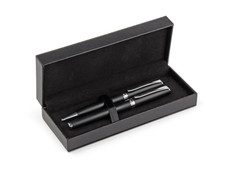 Elegancki zestaw piśmienniczy składający się z długopisu oraz pióra wiecznego. Przybory piśmiennicze wykonane z metalu zapakowane są w etui z czarnej ekoskóry. Długopis z mechanizmem typu twist. Do pióra wiecznego dołączony jest jeden nabój z atramentem. Wkład długopisu oraz atrament naboju do pióra w kolorze czarnym.