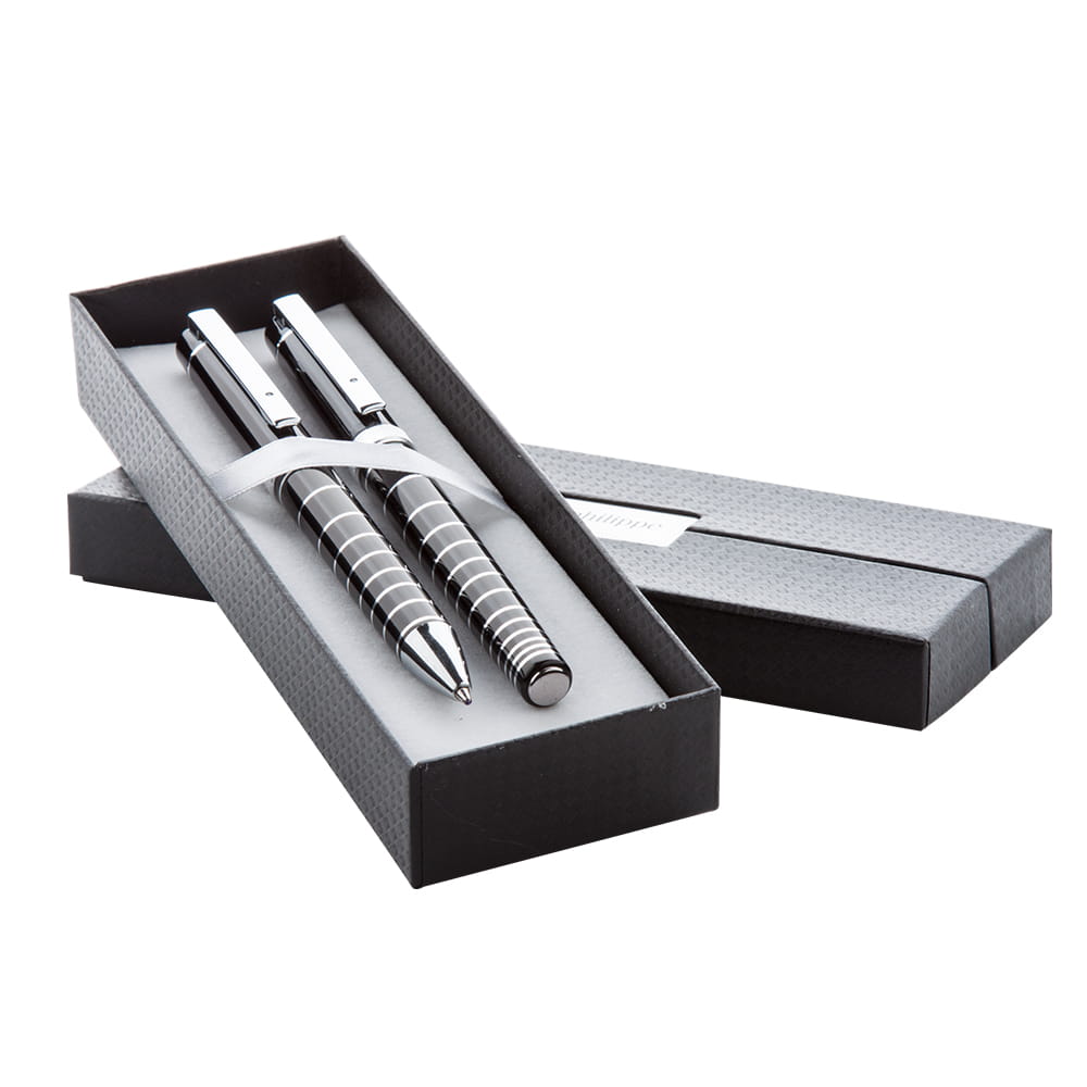 André Philippe, elegancki zestaw - długopis i pióro kulkowe z chromowanymi pierścieniami, dostarczane w czarnym pudełku z niebieskim wkładem.